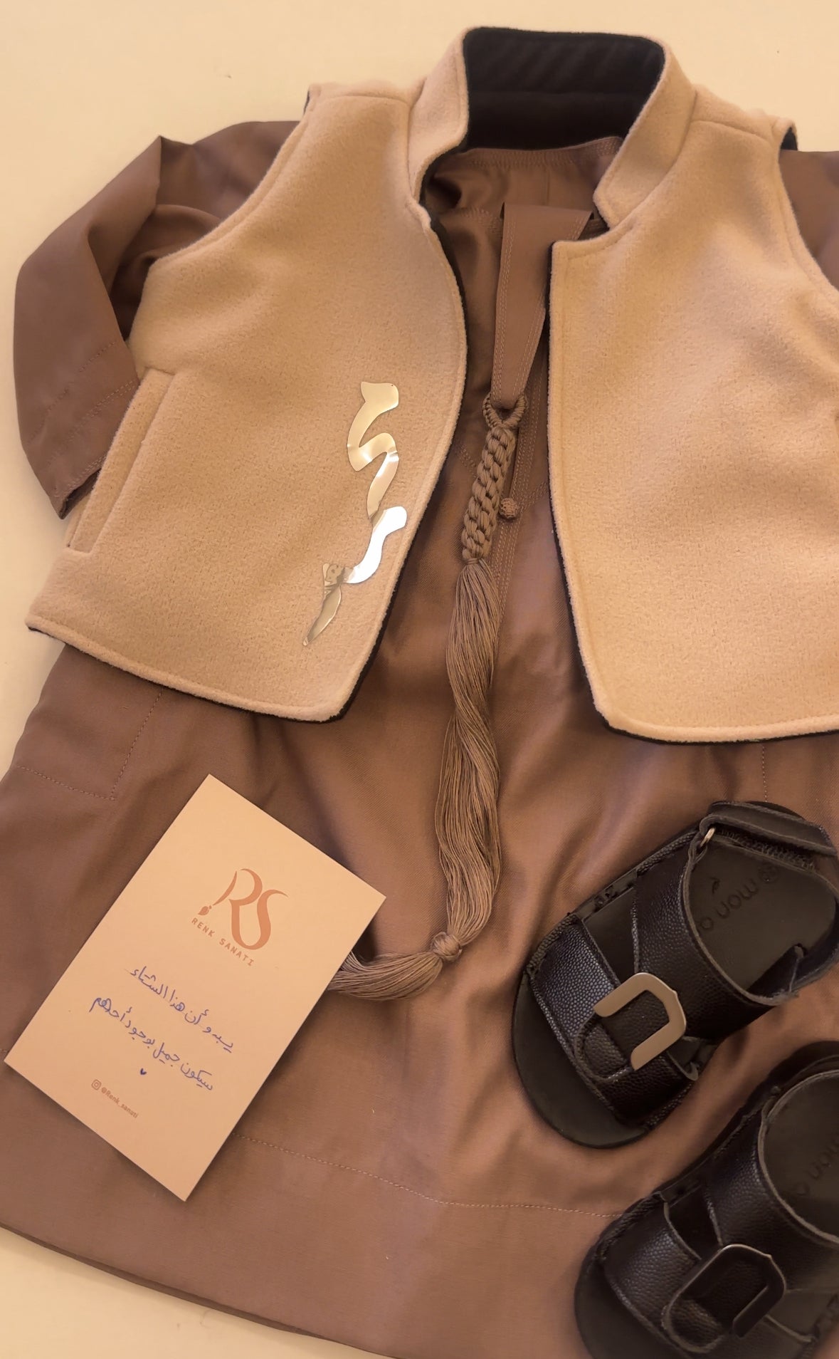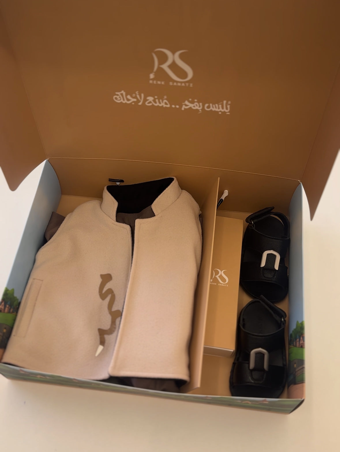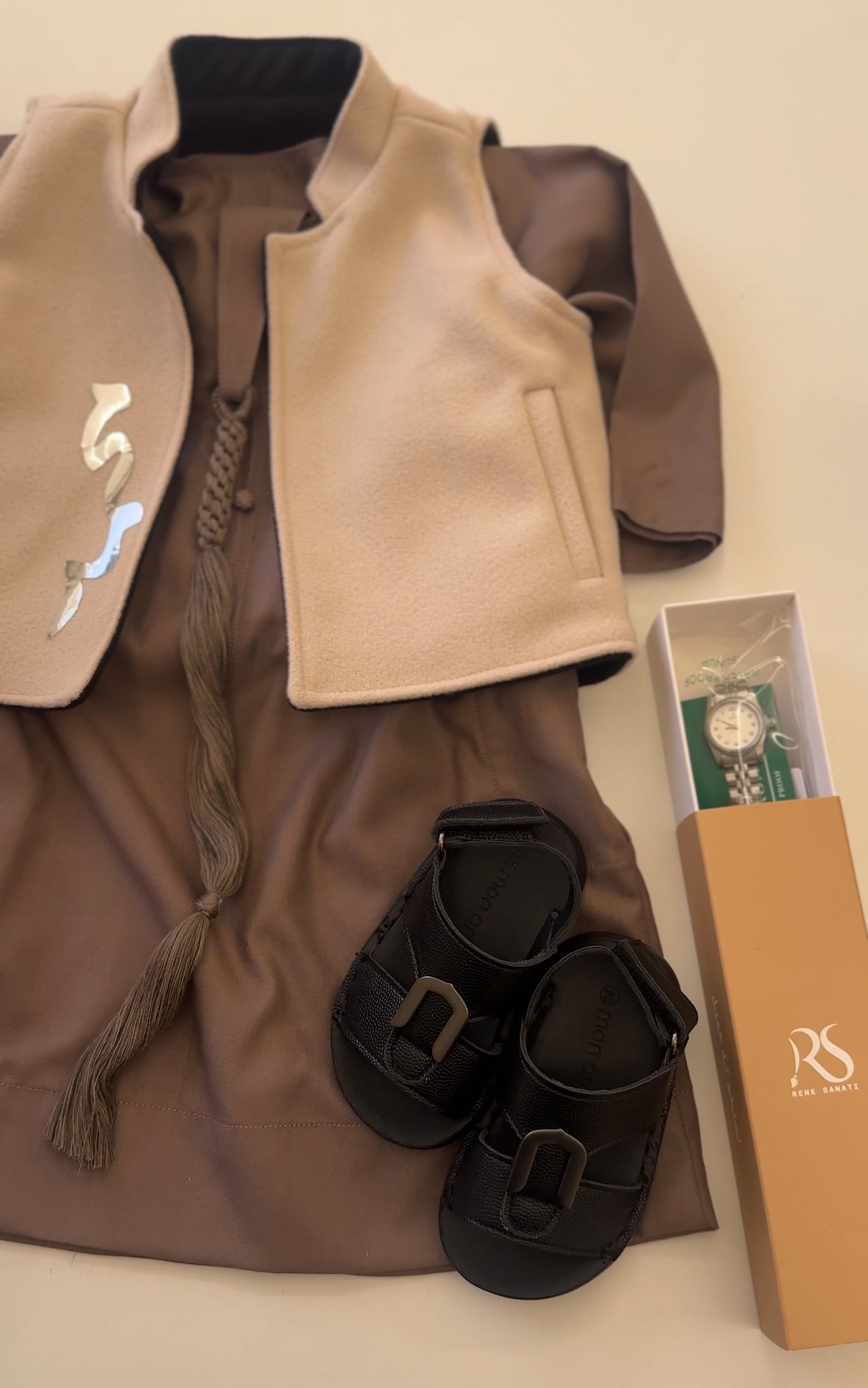 يشمل (الكندورة)+(الكوت)+(النعال)+(الساعة)